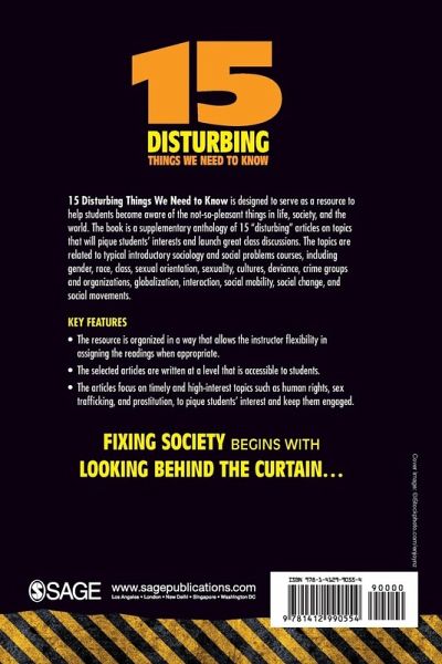15 Disturbing Things We Need to Know is a supplementary anthology of 15 'disturbing' articles on topics designed to pique the students' interests and launch great class discussions. The book is also designed to serve as a resource to help students becoming aware of the not-so-pleasant things in life, society, and the world. The topics are related to typical introductory sociology courses, including gender, race, class, sexual orientation, sexuality, cultures, deviance, crime, groups, organizations, globalization, interaction, social mobility, social change, and social movements.