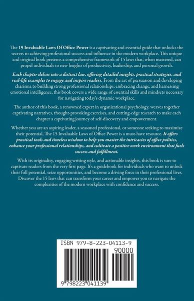 The 15 Invaluable Laws Of Office Power is a captivating and essential guide that unlocks the secrets to achieving professional success and influence in the modern workplace. This unique and original book presents a comprehensive framework of 15 laws that, when mastered, can propel individuals to new heights of productivity, leadership, and personal growth. Each chapter delves into a distinct law, offering detailed insights, practical strategies, and real-life examples to engage and inspire readers. From the art of persuasion and developing charisma to building strong professional relationships, embracing change, and harnessing emotional intelligence, this book covers a wide range of essential skills and mindsets necessary for navigating today's dynamic workplace. The author of this book, a renowned expert in organizational psychology, weaves together captivating narratives, thought-provoking exercises, and cutting-edge research to make each chapter a captivating journey of self-discovery and empowerment. Whether you are an aspiring leader, a seasoned professional, or someone seeking to maximize their potential, The 15 Invaluable Laws of Office Power is a must-have resource. It offers practical tools and timeless wisdom to help you master the intricacies of office politics, enhance your professional relationships, and cultivate a positive work environment that fuels success and fulfillment. With its originality, engaging writing style, and actionable insights, this book is sure to captivate readers from the very first page. It's a guidebook for individuals who want to unlock their full potential, seize opportunities, and become a driving force in their professional lives. Discover the 15 laws that can transform your career and empower you to navigate the complexities of the modern workplace with confidence and success.