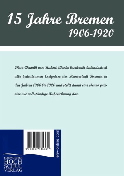 Diese Chronik von Hubert Wania beschreibt kalendarisch alle bedeutsamen Ereignisse der Hansestadt Bremen in den Jahren 1906 bis 1920 und stellt damit eine ebenso präzise wie vollständige Chronik dar.