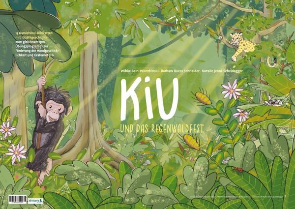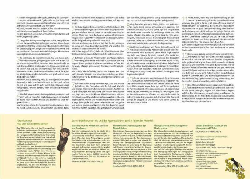Der kleinen Schimpanse Kiu begibt sich gemeinsam mit seinen Freunden Ayo und Zola auf eine spannende Reise, um Früchte und Nüsse für das Regenwaldfest zu sammeln. Doch was als einfacher Ausflug beginnt, entwickelt sich schnell zu einem Abenteuer für Kiu. Glücklicherweise kommt rechtzeitig Hilfe...Die 15 Kamishibai-Bildkarten mit Erzählgeschichte zu «Kiu und das Regenwaldfest» sind Teil des Förderprogramms für Kinder zwischen 3 und 8 Jahren zur Entwicklung der Handgeschicklichkeit bis hin zur Grafomotorik. Im Mittelpunkt steht das nachholende Trainieren der frühkindlichen Bewegungsentwicklung nach dem Konzept der Entwicklung- und Lerntherapie nach PäPKi®.Zusätzlich zu diesen Kamishibai-Bildkarten zum Bewegungsförderprogramm «Kiu und das Regenwaldfest» ist im Handel weiteres Interventionsmaterial zu erwerben, bestehend aus einem Bilderbuch für Kinder (ISBN: 978-3-96543-461-5), einem Handbuch für Fachkräfte (ISBN: 978-3-96543-463-9) und einem Set mit 39 Übungskarten (ISBN: 978-3-96543-462-2).