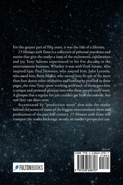 For the greater part of fifty years, it was the ride of a lifetime. 15 Minutes with Fame is a collection of personal anecdotes and stories that give the reader a taste of the excitement, exhilaration and joy Tony Salerno experienced in his five decades in the entertainment business. Whether it was with Fred Astaire, who inspired him; Paul Newman, who assured him; John Lennon, who awed him; Bette Midler, who moved him; or any of the more than four dozen other celebrities and luminaries profiled in these pages, the time Tony spent working with each of them gave him a unique and personal glimpse into who these people really were. A glimpse that a regular fan just couldn't get from the outside, but one they can share now. Accentuated by "production notes" that take the reader behind the scenes of some of the biggest entertainment show and productions of the past half century, 15 Minutes with Fame will transport the reader backstage, as only an insider's perspective can.