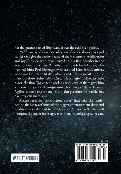 For the greater part of fifty years, it was the ride of a lifetime. 15 Minutes with Fame is a collection of personal anecdotes and stories that give the reader a taste of the excitement, exhilaration and joy Tony Salerno experienced in his five decades in the entertainment business. Whether it was with Fred Astaire, who inspired him; Paul Newman, who assured him; John Lennon, who awed him; Bette Midler, who moved him; or any of the more than four dozen other celebrities and luminaries profiled in these pages, the time Tony spent working with each of them gave him a unique and personal glimpse into who these people really were. A glimpse that a regular fan just couldn't get from the outside, but one they can share now. Accentuated by "production notes" that take the reader behind the scenes of some of the biggest entertainment show and productions of the past half century, 15 Minutes with Fame will transport the reader backstage, as only an insider's perspective can.