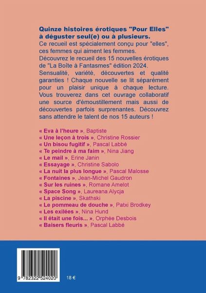 15 histoires érotiques "Pour Elles" à déguster seul(e) ou à plusieurs. Ce recueil est spécialement conçu pour "elles", ces femmes qui aiment les femmes.Découvrez le recueil des 15 nouvelles érotiques de "La Boîte à Fantasmes" édition 2024. Sensualité, variété, découvertes et qualité garanties ! Chaque nouvelle se lit séparément pour un plaisir unique à chaque lecture. Nous pensons que plus que jamais le monde a besoin d'enchantement et de joie, et que cela passe aussi par les talents littéraires en matière érotique. Pas vous ? Vous trouverez dans cet ouvrage collaboratif une source d'émoustillement mais aussi de découvertes parfois surprenantes. Découvrez sans attendre le talent de nos 15 auteurs !"Eva à l'heure", Baptiste"Une leçon à trois", Christine Rossier"Un bisou fugitif", Pascal Labbé"Te peindre à ma faim", Nina Jiang"Le mail", Erine Janin"Essayage", Christine Sabolo"La nuit la plus longue", Pascal Malosse"Fontaines", Jean-Michel Gaudron"Sur les ruines", Romane Amelot"Space Song", Laureana Alycja"La piscine", Skathski"Le pommeau de douche", Patxi Brodkey"Les exilées" Nina Hund"Il était une fois..." Orphée Desbois"Baisers fleuris", Pascal Labbé