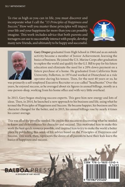 Gary Draper graduated from High School in 1964 and as an outside activity became a member of Junior Achievement, learning the basics of business. He joined the U.S. Marine Corps after graduation to explore the world and qualify for the G.I. Bill to pay for his future education and eliminate the need for a 20% down payment on a future purchase of a home. He graduated from California State University, Fullerton, in 1974 and worked at Disneyland as a ride operator during his tenure. Then, for the next 40 years or so, he was primarily a self-employed Executive Recruiter or a so-called "headhunter." Over the years, he enjoyed success, as he averaged about six figures in annual billings, mostly as a one-person-shop, working from his home office and with very little overhead. In 2013, Gary began studying success experts. This gave him new energy and lots of ideas. Then, in 2014, he launched a new approach to his business and life, using what he termed the Principles of Happiness and Success. He became happier, his business and his character changed for the better, and in 2015, his annual billings rose by nearly 4 times his career average. This was all of the proof he needed. He credits this success to discovering what he needed to know and do to enhance his character and succeed. This motivated him to make this work the best quick resource possible, and inspired him to try to make the world a better place by publishing this work of life advice based on the Principles of Happiness and Success. This work, then, represents the desire of all parents to have their kids learn the basics of happiness and success.