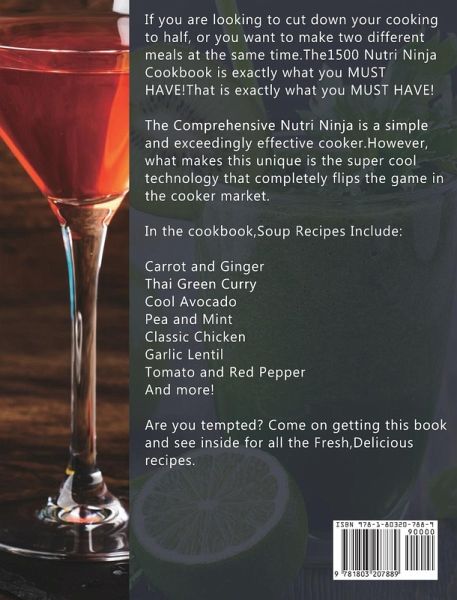 If you are looking to cut down your cooking to half, or you want to make two different meals at the same time.The1500 Nutri Ninja Cookbook is exactly what you MUST HAVE!That is exactly what you MUST HAVE! The Comprehensive Nutri Ninja is a simple and exceedingly effective cooker.However, what makes this unique is the super cool technology that completely flips the game in the cooker market. In the cookbook,Soup Recipes Include:Carrot and Ginger Thai Green Curry Cool Avocado Pea and Mint Classic Chicken Garlic Lentil Tomato and Red Pepper And more! Are you tempted? Come on getting this book and see inside for all the Fresh,Delicious recipes.