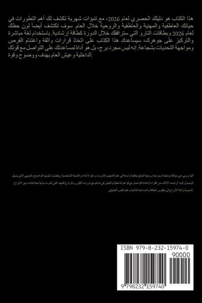 هذا الكتاب هو دليلك الحصري لعام 2026، مع تنبؤات شهرية تكشف لك أهم التطورات في حياتك العاطفية والمهنية والعاطفية والروحية خلال العام. سوف تكتشف أيضاً لون حظك لعام 2026 وبطاقات التارو التي سترافقك خلال الدورة كطاقة إرشادية. باستخدام لغة مباشرة والتركيز على جوهرك، سيساعدك هذا الكتاب على اتخاذ قرارات واثقة واغتنام الفرص ومواجهة التحديات بشجاعة. إنه ليس مجرد برج، بل هو أداة لمساعدتك على التواصل مع قوتك الداخلية وعيش العام بهدف ووضوح وقوة.