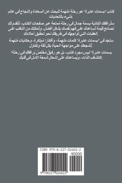 كتاب "بسمات عابرة" هو رحلة مُلهمة للبحث عن السعادة والنجاح في عالم مُليء بالتحديات. ستُرافقك الكاتبة بسمة جمال في رحلة مُمتعة عبر صفحات الكتاب، لتُقدم لكِ نصائح قيّمة تُساعدك على فهم نفسكِ بشكل أفضل، وتُمكنك من التغلب على العقبات التي تواجهكِ في طريقكِ نحو تحقيق أحلامكِ. ستجد في "بسمات عابرة" كلمات مُلهمة، وأفكارًا مُبتكرة، وحكايات مُلهمة تُشجعكِ على مواجهة الحياة بكل ثقة وتفاؤل. "بسمات عابرة" ليس مجرد كتاب، بل هو رفيقٌ مُخلصٌ يُرافقكِ في رحلة اكتشاف الذات، ويُساعدكِ على إشعال شمعة الأمل في قلبكِ.