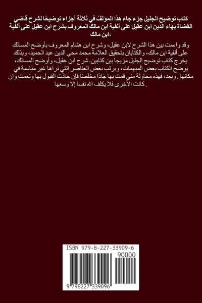 كتاب توضيح الجليل جزء جاء هذا المؤلفُ في ثلاثة أجزاء توضيحًا لشرح قاضي القضاة بهاء الدين ابن عقيل على ألفية ابن مالك المعروف بشرح ابن عقيل على ألفية ابن مالك، وقد واءمت بين هذا الشرح لابن عقيل، وشرح ابن هشام المعروف بأوضح المسالك على ألفية ابن مالك، والكتابان بتحقيق العلامة محمد محي الدين عبد الحميد، وبذلك يخرج كتاب توضيح الجليل مزيجا بين كتابين شرح ابن عقيل، وأوضح المسالك، يوضح الكتاب بعض المبهمات، ويرتب بعض العناصر التي نراها غير مناسبة في مكانها . وبعد، فهذه محاولة مني قمت بها جادًا مخلصًا فإن حاذت القبول بها ونعمت وإن كانت الأخرى فلا يكلف الله نفسا إلا وسعها .