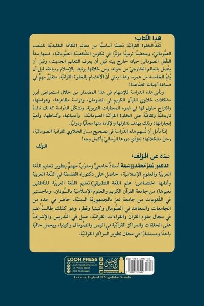 Qurʾānic Schools in Somalia: Challenges and Solutions The Qurʾānic school is considered a fundamental landmark of the traditional culture of the Somali people, and an influential educational incubator in the formation of the Somali personality. It is where the Somali child begins his life outside his home before knowing modern education, and before connecting with the outside world around him. Through it, he becomes associated with Islam and its principles before reaching the age of five. This means that attention to the Quranic school is an important variable in shaping our rising generations. This study comes to contribute to this field by reviewing the most prominent problems of Quranic schools in Somalia, studying their manifestations and factors, and proposing solutions for them in light of educational data. The study also forms a historical and cultural window on the Somali Quranic school, its literature, patterns, and most important achievements; with the aim of circulating and benefiting from it locally and internationally. Dr. ʿUmar Moḥamed Warsame. Lecturer and academic interested in developing the teaching of Arabic language and Islamic sciences, holder of a Ph.D in Philosophy in Arabic Language and Literature, specialising in: Applied Linguistics (teaching Arabic to non-native speakers) from Jami'at al-Qur'an al-Karim wa al-'Ulum al-Islamiyya in Sudan, and a Master's degree in Linguistics from Jami'at Ta'izz in the Republic of Yemen. He has lectured at a number of universities and institutes in Somalia, Kenya and Qatar, and is also a student of Quranic sciences and Quranic readings. He has worked in teaching and supervising Quranic circles and centres in Yemen, Somalia and Kenya, and currently works as a researcher and consultant in the field of developing Quranic centres for a number of Quranic institutions and associations. تقديم عبد الرشيد بن الشيخ علي صوفي والشيخ أحمد حاج قاسم.تعد الخلوة القرآنية معلمًا أساسيًا من معالم الثقافة التقليدية للشعب الصومالي، ومحضنا تربويا مؤثرًا في تكوين الشخصية الصومالية، فمنها يبدأ الطفل الصومالي حياته خارج بيته قبل أن يعرف التعليم الحديث، وقبل أن يتصل بالعالم الخارجي من حوله، ومن خلالها يرتبط بالإسلام ومبادئه قبل أن يتم الخامسة من عمره. وهذا يعني أن الاهتمام بالخلوة القرآنية، متغير مهم في صياغة أجيالنا الصاعدةوتأتي هذه الدراسة للإسهام في هذا المضمار من خلال استعراض أبرز مشكلات خلاوي القرآن الكريم في الصومال، ودراسة مظاهرها ، وعواملها ، واقتراح حلول لها في ضوء المعطيات التربوية. وتشكل الدراسة كذلك نافذة تاريخية وثقافية على الخلوة القرآنية الصومالية، وادبياتها، وأنماطها ، وأهم إنجازاتها ؛ وذلك بهدف تداولها والإفادة منها محليا ودوليا.