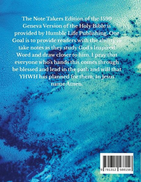 The Note Takers Edition of the 1599 Geneva Version of the Holy Bible is provided by Humble Life Publishing. Our Goal is to provide readers with the ability to take notes as they study God's Inspired Word and draw closer to him. I pray that everyone who's hands this comes through be blessed and lead in the path and will that YHWH has planned for them, In Jesus name Amen.