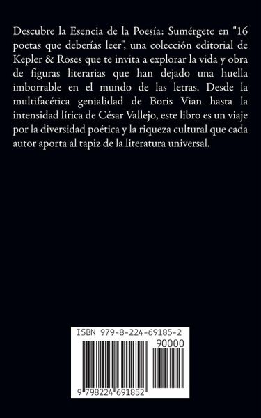 Descubre la Esencia de la Poesía: Sumérgete en "16 poetas que deberías leer", una colección editorial de Kepler & Roses que te invita a explorar la vida y obra de figuras literarias que han dejado una huella imborrable en el mundo de las letras. Desde la multifacética genialidad de Boris Vian hasta la intensidad lírica de César Vallejo, este libro es un viaje por la diversidad poética y la riqueza cultural que cada autor aporta al tapiz de la literatura universal.
