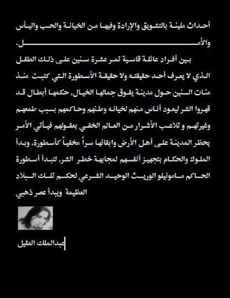 نبذة عن الكتاب بين أفراد عائلة قاسية تمر عشرة سنين على ذلك الطفل الذي لا يعرف أحد حقيقته ولا حقيقة الأسطورة التي كتبت منذ مئات السنين حول مدينة يفوق جمالها الخيال, حكمها أبطال قد قهروا الشر ليعود أناس منهم لخيانه وطنهم وحاكمهم بسبب طمعهم وغيرتهم و تلاعب الأشرار من العالم الخفي بعقولهم فيأتي الأمر بحظر المدينة على أهل الأرض وابقائها سراً مخفياً كأسطورة, ولا يعرف أحد من العامة أن اللحظة التي قد ظهرفيها هذا الطفل أمام باب منزل هذه العائلة قد بدأ الشر ينشر جنوده حول البلاد لينتقم, وبدأ الملوك والحكام بتجهيز أنفسهم لمجابهة خطر هذا الشر, لتبدأ الأحداث و يبدأ الظلام ليأتي النصر على يد الخونة الذين خانوا بلادهم منذ مئات السنين والذين يجبرهم ظهور الحاكم الشرعي على تنفيذ أمره و القتال معه حتى النصر على خادم النار وجنوده الأشرار, لتبدأ أسطورة الحاكم مامونيلو الوريث الوحيد الشرعي لحكم تلك البلاد العظيمة ويبدأ عصر ذهبي ليعم السلام والأمان على جميع البلاد التي اتحد حكامها وملوكها وقادتها لمواجهة هذه الشرور الكبيرة ......