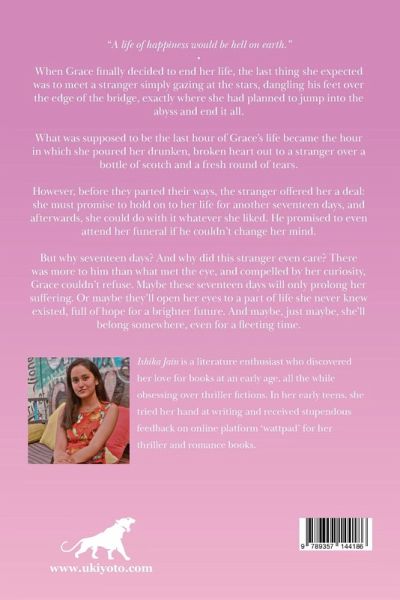 "A life of happiness would be hell on earth." ¿ When Grace finally decided to end her life, the last thing she expected was to meet a stranger simply gazing at the stars, dangling his feet over the edge of the bridge, exactly where she had planned to jump into the abyss and end it all. What was supposed to be the last hour of Grace's life became the hour in which she poured her drunken, broken heart out to a stranger over a bottle of scotch and a fresh round of tears. However, before they parted their ways, the stranger offered her a deal: she must promise to hold on to her life for another seventeen days, and afterwards, she could do with it whatever she liked. He promised to even attend her funeral if he couldn't change her mind. But why seventeen days? And why did this stranger even care? There was more to him than what met the eye, and compelled by her curiosity, Grace couldn't refuse. Maybe these seventeen days will only prolong her suffering. Or maybe they'll open her eyes to a part of life she never knew existed, full of hope for a brighter future. And maybe, just maybe, she'll belong somewhere, even for a fleeting time.