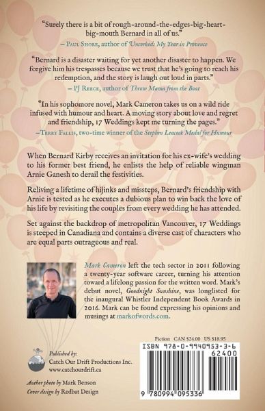 When Bernard Kirby receives an invitation for his ex-wife's wedding to his former best friend, he enlists the help of reliable wingman Arnie Ganesh to derail the festivities. Reliving a lifetime of hijinks and missteps, Bernard’s friendship with Arnie is tested as he executes a plan to win back the love of his life by revisiting the couples from every wedding he has attended. Set against the backdrop of metropolitan Vancouver, 17 Weddings explores both the institution of marriage and the true meaning of friendship. With a diverse cast of characters who are both ridiculous and real, this story is a wild ride through a life that is as outlandish as it is ordinary. Advance Praise for 17 Weddings: "In his sophomore novel, Mark Cameron takes us on a wild ride infused with humour and heart. A moving story about love and regret and friendship, 17 Weddings kept me turning the pages. I didn't want it to end, and I was sad when it did." ~Terry Fallis, two-time winner of the Stephen Leacock Medal for Humour "Bernard is a disaster waiting for yet another disaster to happen. We forgive him his trespasses because we trust that he's going to reach his redemption, and the story is laugh out loud in parts. I hope every woman reads this book. They’ll loathe the protagonist; they might want to kill him, or worse. Until it’s revealed what suffering some men must endure before leaving their narcissistic strategies behind. Here’s Mark Cameron’s take on the long, hard journey to growing up." ~PJ Reece, author of Throw Mama from the Boat "Whether in the midst of relationship challenges or even if life is speeding along swimmingly, you will be uplifted and entertained by 17 Weddings. Mark Cameron’s clever and thought-provoking writing style offers up some chuckles—and might just improve your chances of smooth sailing when the choppy seas of life come your way. For surely there is a bit of rough-around-the-edges-big-heart-big-mouth Bernard in all of us, though hopefully not too much!" ~Paul Shore, author of Uncorked: My Year in Provence