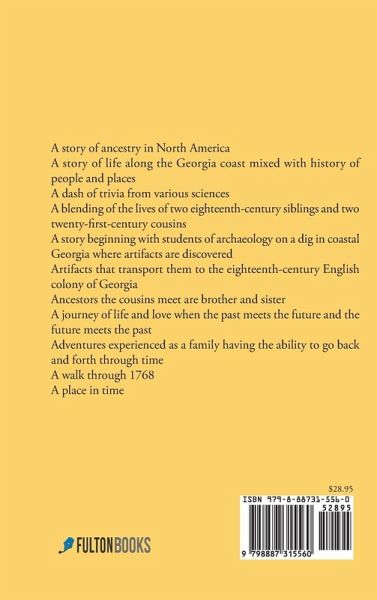 A story of ancestry in North America A story of life along the Georgia coast mixed with history of people and places A dash of trivia from various sciences A blending of the lives of two eighteenth-century siblings and two twenty-first-century cousins A story beginning with students of archaeology on a dig in coastal Georgia where artifacts are discovered Artifacts that transport them to the eighteenth-century English colony of Georgia Ancestors the cousins meet are brother and sister A journey of life and love when the past meets the future and the future meets the past Adventures experienced as a family having the ability to go back and forth through time A walk through 1768 A place in time