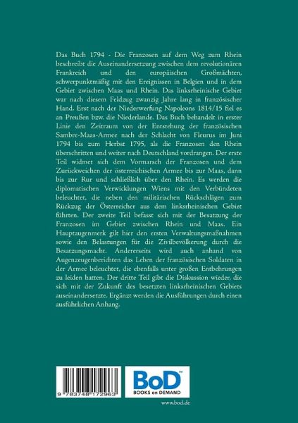 Das Buch 1794 - Die Franzosen auf dem Weg zum Rhein beschreibt die Auseinandersetzung zwischen dem revolutionären Frankreich und den europäischen Großmächten, schwerpunktmäßig mit den Ereignissen in Belgien und in dem Gebiet zwischen Maas und Rhein. Das linksrheinische Gebiet war nach diesem Feldzug zwanzig Jahre lang in französischer Hand. Erst nach der Niederwerfung Napoleons 1814/15 fiel es an Preußen bzw. die Niederlande. Das Buch behandelt in erster Linie den Zeitraum von der Entstehung der französischen Sambre-Maas-Armee nach der Schlacht von Fleurus im Juni 1794 bis zum Herbst 1795, als die Franzosen den Rhein überschritten und weiter nach Deutschland vordrangen. Der erste Teil widmet sich dem Vormarsch der Franzosen und dem Zurückweichen der österreichischen Armee bis zur Maas, dann bis zur Rur und schließlich über den Rhein. Es werden die diplomatischen Verwicklungen Wiens mit den Verbündeten beleuchtet, die neben den militärischen Rückschlägen zum Rückzug der Österreicher aus dem linksrheinischen Gebiet führten. Der zweite Teil befasst sich mit der Besatzung der Franzosen im Gebiet zwischen Rhein und Maas. Ein Hauptaugenmerk gilt hier den ersten Verwaltungsmaßnahmen sowie den Belastungen für die Zivilbevölkerung durch die Besatzungsmacht. Andererseits wird auch anhand von Augenzeugenberichten das Leben der französischen Soldaten in der Armee beleuchtet, die ebenfalls unter großen Entbehrungen zu leiden hatten. Der dritte Teil gibt die Diskussion wieder, die sich mit der Zukunft des besetzten linksrheinischen Gebiets auseinandersetzte. Ergänzt werden die Ausführungen durch einen ausführlichen Anhang.