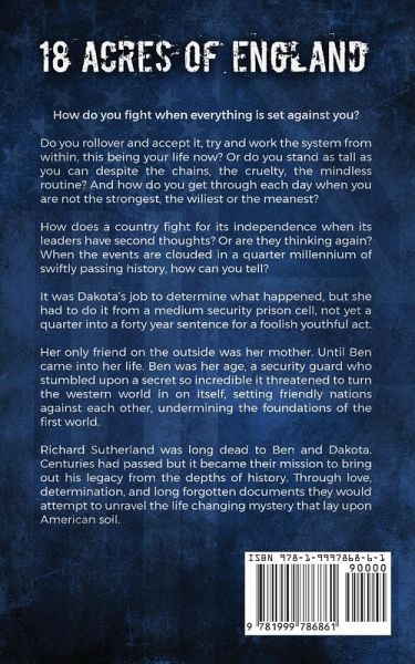 How do you fight when everything is set against you? Do you rollover and accept it, try and work the system from within, this being your life now? Or do you stand as tall as you can despite the chains, the cruelty, the mindless routine? And how do you get through each day when you are not the strongest, the wiliest or the meanest? How does a country fight for its independence when its leaders have second thoughts? Or are they thinking again? When the events are clouded in a quarter millennium of swiftly passing history, how can you tell? It was Dakota's job to determine what happened, but she had to do it from a medium security prison cell, not yet a quarter into a forty year sentence for a foolish youthful act. Her only friend on the outside was her mother. Until Ben came into her life. Ben was her age, a security guard who stumbled upon a secret so incredible it threatened to turn the western world in on itself, setting friendly nations against each other, undermining the foundations of the first world. Richard Sutherland was long dead to Ben and Dakota. Centuries had passed but it became their mission to bring out his legacy from the depths of history. Through love, determination, and long forgotten documents they would attempt to unravel the life changing mystery that lay upon American soil.