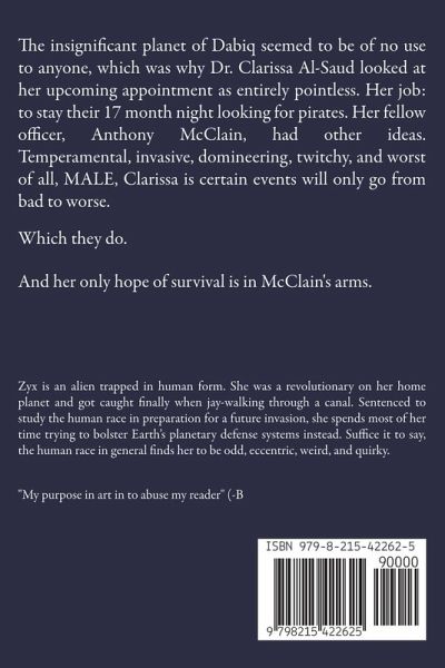 The insignificant planet of Dabiq seemed to be of no use to anyone, which was why Dr. Clarissa Al-Saud looked at her upcoming appointment to stay their 17 month night looking for pirates as entirely pointless. Her fellow officer, Anthony McClain, has other ideas. Temperamental, invasive, domineering, twitchy, and worst of all, MALE, Clarissa is certain events will only go from bad to worse. Which they do. And her only hope of survival is in McClain's arms. TONY Tony wanted to hit himself; he just actually conceptualized the end result of his growing obsession for Claire: the woman who was given no choice but to be exiled with him thousands of kilometers from civilization and who he was beginning to think of as his. JARED Claire shook her head, strands of hair fell about her face, and she slipped straight into bitch-mode. "Okay, so you decided that for my training the hair had to go. Lets stop and think for a minute about all the fucking different ways you could have accomplished this." She lifted up her middle finger, "Number 1: you could have asked me." She lifted up her other middle finger, "Number 2: you could have written a memo." Her index finger joined her middle finger, "Number 3: you c-..." Jared had never seen anything more wonderful in all of his years training. CLAIRE "Look. It's a total loony bin up there! Do you want me to tell you that only MacComhaill knows what the hell is going on down here and he's not even in the operations command, or shall I get into the fact that our contract between my 'merchants' and his mercenaries is enforced by polyandrous-woman-kidnappers?!"