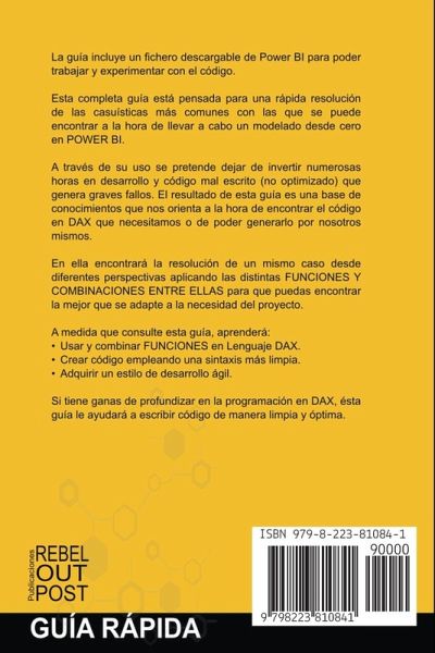 La guía incluye un archivo de Power BI descargable para que pueda trabajar y experimentar con el código. Esta completa guía está pensada para una rápida resolución de las casuísticas más comunes con las que se puede encontrar a la hora de llevar a cabo un modelado desde CERO en POWER BI. A través de su uso se pretende dejar de invertir numerosas horas en desarrollo y código mal escrito (no optimizado) que genera graves fallos. El resultado de esta guía es una base de conocimientos que nos orienta a la hora de encontrar el código en DAX que necesitamos o de poder generarlo por nosotros mismos. En ella encontrará la resolución de un mismo caso desde diferentes perspectivas aplicando las distintas FUNCIONES Y COMBINACIONES ENTRE ELLAS para que puedas encontrar la mejor que se adapte a la necesidad del proyecto. A medida que consulte esta guía, aprenderá:Usar y combinar FUNCIONES en Lenguaje DAX. Crear código empleando una sintaxis más limpia. Adquirir un estilo de desarrollo ágil. Si tiene ganas de profundizar en la programación en DAX, ésta guía le ayudará a escribir código de manera limpia y óptima.