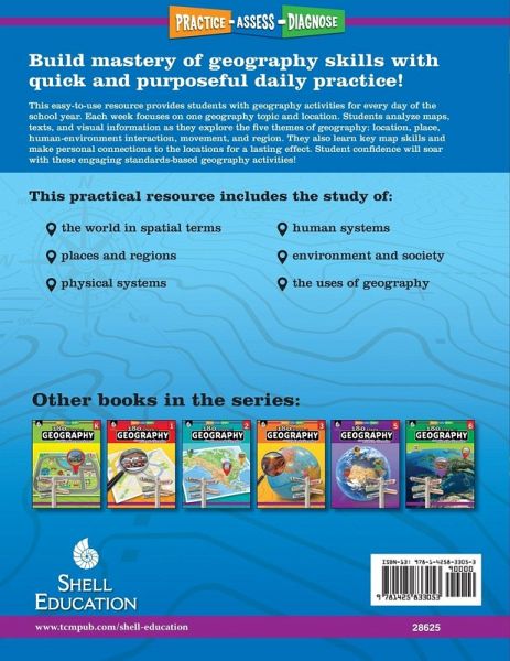 180 Days of Geography is a fun and effective daily practice workbook designed to help students learn about geography. This easy-to-use fourth grade workbook is great for at-home learning or in the classroom. The engaging standards-based activities cover grade-level skills with easy to follow instructions and an answer key to quickly assess student understanding. Each week students will explore a new topic focusing on map skills, applying information and data, and connecting what they have learned. Watch students build confidence as they learn about location, place, human-environment interaction, movement, and regions with these quick independent learning activities. Parents appreciate the teacher-approved activity books that keep their child engaged and learning. Great for homeschooling, to reinforce learning at school, or prevent learning loss over summer.Teachers rely on the daily practice workbooks to save them valuable time. The ready to implement activities are perfect for daily morning review or homework. The activities can also be used for intervention skill building to address learning gaps.
