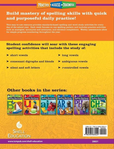 180 Days of Spelling and Word Study is a fun and effective daily practice workbook designed to help students improve their spelling skills. This easy-to-use third grade workbook is great for at-home learning or in the classroom. The engaging standards-based activities cover grade-level skills with easy to follow instructions and an answer key to quickly assess student understanding. Each week students learn 15 words, focusing on spelling rules, patterns, and vocabulary. Watch students become better spellers with these quick independent learning activities.Parents appreciate the teacher-approved activity books that keep their child engaged and learning. Great for homeschooling, to reinforce learning at school, or prevent learning loss over summer.Teachers rely on the daily practice workbooks to save them valuable time. The ready to implement activities are perfect for daily morning review or homework. The activities can also be used for intervention skill building to address learning gaps.