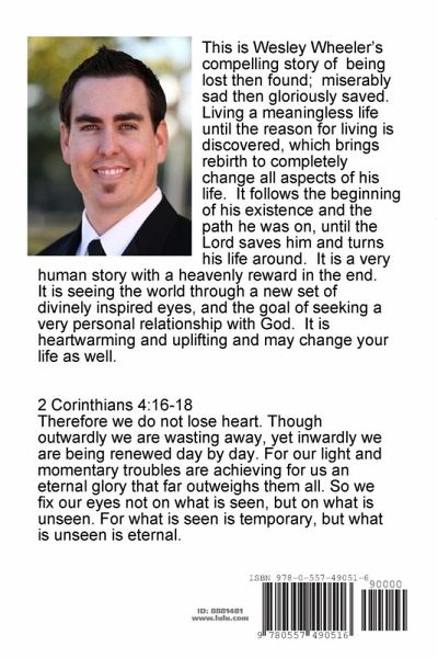 This is Wesley Wheeler's compelling story of being lost then found; miserably sad then gloriously saved. Living a meaningless life until the reason for living is discovered, which brings rebirth to completely change all aspects of his life. It follows the beginning of his existence and the path he was on, until the Lord saves him and turns his life around. It is a very human story with a heavenly reward in the end. It is seeing the world through a new set of divinely inspired eyes, and the goal of seeking a very personal relationship with God. It is heartwarming and uplifting and may change your life as well.