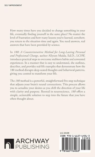 How many times have you decided to change something in your life, eventually finding yourself in the same place? No matter the level of frustration and how many lessons you've learned, somehow, you return to the situation time and again. You need answers, real answers that have been provided by science. In 180: A Counterintuitive Method for Long-Lasting Personal and Professional Change, author Allyson Maida, Ed.D., LCSW, introduces practical steps to overcome stubborn habits and unwanted experiences. In a manner that is easy to understand, she outlines, describes, and provides real-life examples that demonstrate how the 180 method disrupts deep-seated thoughts and behavioral patterns, giving you control to transform your life. The 180 method is a powerful, straightforward five-step technique that adjusts your brain's neural connections. This process allows you to actualize your desires as you shift the direction of your life with clarity and purpose. Rooted in neuroscience, 180 offers a simple, actionable solution to step into the future that you have often thought about.