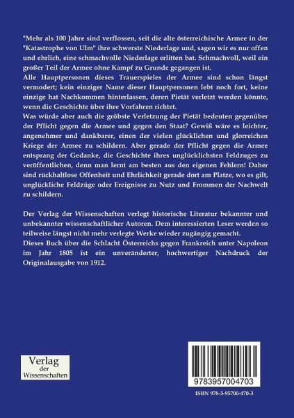 Dieses Buch über die Schlacht Österreichs gegen Frankreich unter Napoleon im Jahr 1805 ist ein unveränderter, hochwertiger Nachdruck der Originalausgabe von 1912.