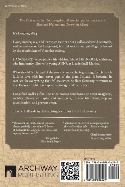 Love, murder, sex, and terrorism swirl within a collapsed world economy. No, it's not today. It's London, 1884. Recently married LANGSFORD, born of wealth and privilege, is bound by the restrictions of Victorian society. Dynamite has been invented, but the term "homosexuality" has not and men can be arrested for either. Langsford accompanies his visiting friend, HEINRICH, eighteen, who innocently flirts with young ANNA at London's Leadenhall Market. What should be the end of the story becomes the beginning, for Heinrich falls in love with her, never part of the plan. Instead it becomes the catalyst for everything that follows when he flees Germany to return to her. Events unfold that expose terrorists, espionage and international intrigue. Langsford walks a fine line as he crosses boundaries he never imagined, rubbing elbows with spies, killers and would-be assassins to save his friend, stop an assassination, and prevent a war.