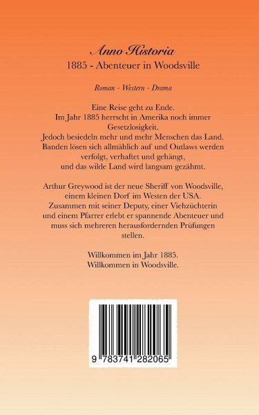 Anno Historia: 1885 - Abenteuer in WoodsvilleRoman - Western - DramaEine Reise geht zu Ende.Im Jahr 1885 herrscht in Amerika noch immer Gesetzlosigkeit.Jedoch besiedeln mehr und mehr Menschen das Land.Banden lösen sich allmählich auf und Outlaws werden verfolgt, verhaftet und gehängt,und das wilde Land wird langsam gezähmt.Arthur Greywood ist der neue Sheriff von Woodsville,einem kleinen Dorf im Westen der USA.Zusammen mit seiner Deputy, einer Viehzüchterin und einem Pfarrer erlebt er spannende Abenteuer und muß sich mehreren herausfordernden Prüfungen stellen.Willkommen im Jahr 1885.Willkommen in Woodsville.