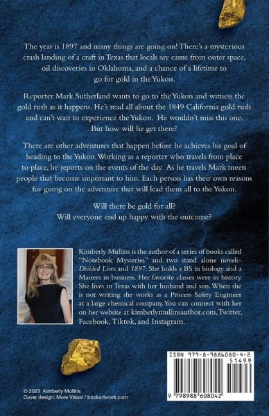 The year is 1897 and many things are going on! There's a mysterious crash landing of a craft in Texas that locals say came from outer space, oil discoveries in Oklahoma, and a chance of a lifetime to go for gold in the Yukon. Reporter Mark Sutherland wants to go to the Yukon and witness the gold rush as it happens. He's read all about the 1849 California gold rush and can't wait to experience the Yukon. He wouldn't miss this one. But how will he get there? There are other adventures that happen before he achieves his goal of heading to the Yukon. Working as a reporter who travels from place to place, he reports on the events of the day. As he travels Mark meets people that become important to him. Each person has their own reasons for going on the adventure that will lead them all to the Yukon. Will there be gold for all? Will everyone end up happy with the outcome?
