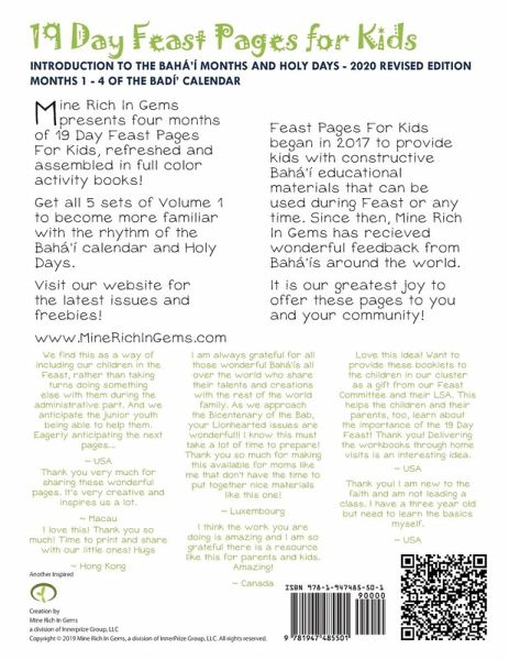 Volume 1: Introduction to the Bahá'í Months and Holy Days Months 1 - 4: Bahá, Jalál, Jamál, & 'Azamat Ages: 4-14 The 19 Day Feast Pages for Kids activity books are designed to assist young ones in learning the rhythm of the Badí' calendar. Each activity book bundles four months of Bahá'í-inspired workbooks. These workbooks can be used to support children's spiritual education programs for Nineteen Day Feasts, Holy Days, children's classes, junior youth groups, devotional gatherings, firesides, study circles, home visits, seasonal schools, unit conventions, and more. Activities in the workbooks strengthen Bahá'í facts, vocabulary, concepts, and identity. There are questions for critical thinking, quotes to recite, Gems Kids skits, relaxing colouring pages, word games for building vocabulary and thinking skills, storytelling for holy days, arts and crafts, and topics for discussion and consultation. Each monthly workbook contains: Questions about the Bahá'í Writings Dialog and skit known as Gems Kids Talk Colouring Pages Word Puzzles Arts and Crafts Snack recipes Story and Music Suggestions and an inspiring message about the Bahá'í Fund This resource has been diligently created by the Mine Rich in Gems family, a small family business.