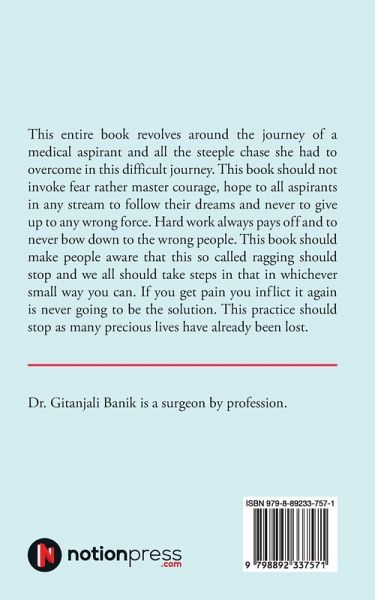This entire book revolves around the journey of a medical aspirant and all the steeple chase she had to overcome in this difficult journey.This book should not invoke fear rather master courage, hope to all aspirants in any stream to follow their dreams and never to give up to any wrong force.Hard work always pays off and to never bow down to the wrong people.This book should make people aware that this so called ragging should stop and we all should take steps in that in whichever small way you can.If you get pain you inflict it again is never going to be the solution.This practice should stop as many precious lives have already been lost.