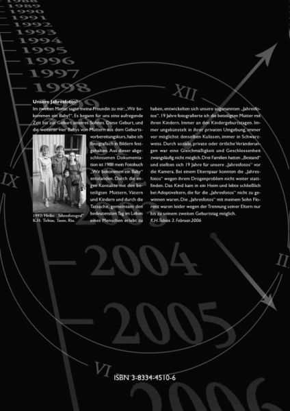 Im zweiten Monat sagte meine Freundin zu mir: ¿Wir bekommen ein Baby!¿. Es begann für uns eine aufregende Zeit bis zur Geburt unseres Sohnes. Diese Geburt, und die weiterer vier Babys von Müttern aus dem Geburtsvorbereitungskurs, habe ich fotografisch in Bildern festgehalten. Aus dieser abgeschlossenen Dokumentation ist 1988 mein Fotobuch ¿Wir bekommen ein Baby¿ entstanden. Durch die engen Kontakte mit den beteiligten Müttern, Vätern und Kindern und durch die Tatsache, gemeinsam den bedeutendsten Tag im Leben eines Menschen erlebt zu haben, entwickelten sich unsere so genannten ¿Jahresfotos¿. 19 Jahre fotografierte ich die beteiligten Mütter mit ihren Kindern. Immer an den Kindergeburtstagen. Immer ungekünstelt in ihrer privaten Umgebung, immer vor möglichst denselben Kulissen, immer in Schwarzweiss. Durch soziale, private oder örtliche Veränderungen war eine Gleichmäßigkeit und Geschlossenheit zwangsläufig nicht möglich. Drei Familien hatten ¿Bestand¿ und stellten sich 19 Jahre für unsere ¿Jahresfotos¿ vor die Kamera. Bei einem Elternpaar konnten die ¿Jahresfotos¿ wegen ihrem Drogenproblem nicht weiter stattfinden. Das Kind kam in ein Heim und lebte schließlich bei Adoptiveltern, die für die ¿Jahresfotos¿ nicht zu gewinnen waren. Die ¿Jahresfotos¿ mit meinem Sohn Florenz waren leider wegen der Trennung seiner Eltern nur bis zu seinem zweiten Geburtstag möglich.