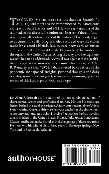 The COVID-19 virus, more serious than the Spanish flu of 1917, will perhaps be remembered by Americans along with Pearl Harbor and 9/11. In the early months of the outbreak of the disease, the author, an observer of the confusion reigning on all continents about the nature of the beast, began to document its daily progress. Also recorded were the efforts made by elected officials, health-care providers, scientists and economists to thwart the death march of the contagion throughout the United States. Along the way, another ugliness, racism, had to be addressed. A virtual war against these stealth-like adversaries is presented in chronicle form in what Allen R. Remaley entitles, "19". Sidebars caused by the stress of the pandemic are exposed. Insights, personal thoughts and daily updates, sometimes poignant, sometimes humorous, give us a record of this harbinger of death and hope.