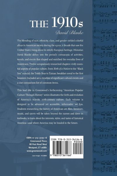 The decade of the 1910s saw the United States rise above strictly European cultural influences as the mixing of race, ethnicity, class, and gender yielded colorful fusions within American society. Historian David Blanke delves into the cornucopia of activities, trends, and events that shaped and enriched the day-to-day lives of Americans in this decade. Twelve scrupulously researched chapters bring to life all of the important aspects of popular culture in 1910s America: from Birth of a Nation to the Black Sox scandal, the Teddy Bear to Tarzan, breakfast cereal to the first brassiere. This lead title in Greenwood's forthcoming American Popular Culture Through History series shows the many facets of American society merging to form the beginnings of the United States' eclectic 20th century culture. This debut volume launches a series designed to be advanced yet accessible, informative yet fun. Students researching the history of American art, film, literature, music, and sports will be taken beyond the names and dates in their textbooks and learn about the interests, styles, and tastes of past Americans. Series volumes will also include a timeline of significant cultural events as well as a cost comparison list of commonly used items. This valuable reference resource will introduce students to things, activities, and people that enriched and defined the lives of Americans in the seminal years of 1910 to 1919. These collages of culture will enrich the research of high school or college students and help them see how Americans' lives, aspirations, dreams, even the idea of what it is to be American, have evolved in the past-and will continue to change in the future.