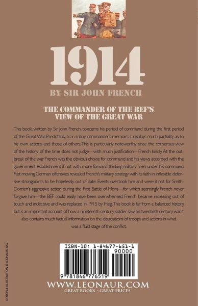 The commander of the BEF's view of the Great War This book, written by Sir John French, concerns his period of command during the first period of the Great War. Predictably, as in many commander's memoirs it displays much partiality as to his own actions and those of others. This is particularly noteworthy since the consensus view of the history of the time does not judge-with much justification-French kindly. At the outbreak of the war French was the obvious choice for command and his views accorded with the government establishment if not with more forward thinking military men under his command. Fast moving German offensives revealed French's military strategy with its faith in inflexible defensive strongpoints to be hopelessly out of date. Events overtook him and were it not for Smith-Dorrien's aggressive action during the First Battle of Mons-for which seemingly French never forgave him-the BEF could easily have been overwhelmed. French became increasing out of touch and indecisive and was replaced in 1915 by Haig. This book is far from a balanced history, but is an important account of how a nineteenth century soldier saw his twentieth century war. It also contains much factual information on the dispositions of troops and actions in what was a fluid stage of the conflict.