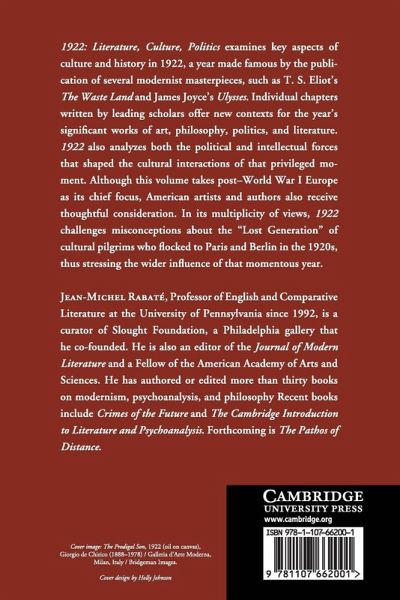 1922: Literature, Culture, Politics examines key aspects of culture and history in 1922, a year made famous by the publication of several modernist masterpieces, such as T. S. Eliot's The Waste Land and James Joyce's Ulysses. Individual chapters written by leading scholars offer new contexts for the year's significant works of art, philosophy, politics, and literature. 1922 also analyzes both the political and intellectual forces that shaped the cultural interactions of that privileged moment. Although this volume takes post-World War I Europe as its chief focus, American artists and authors also receive thoughtful consideration. In its multiplicity of views, 1922 challenges misconceptions about the 'Lost Generation' of cultural pilgrims who flocked to Paris and Berlin in the 1920s, thus stressing the wider influence of that momentous year.