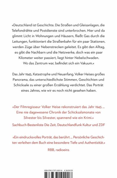 Volker Heise legt eine atemberaubend erzählte Chronik vor, die das ganze Jahr 1945 umspannt, von Silvester bis Silvester. Tagebücher, Briefe, Erinnerungen, aber auch unveröffentlichtes Archivmaterial, darunter Augenzeugenberichte, erlauben eine einzigartige Perspektive. Stimmen, Beobachtungen und Geschichten werden zu einer großenErzählung verwoben, die unterschiedlichste Schicksale unmittelbar miteinander verknüpft. Das Porträt eines Jahres, wie wir es noch nicht gesehen haben.