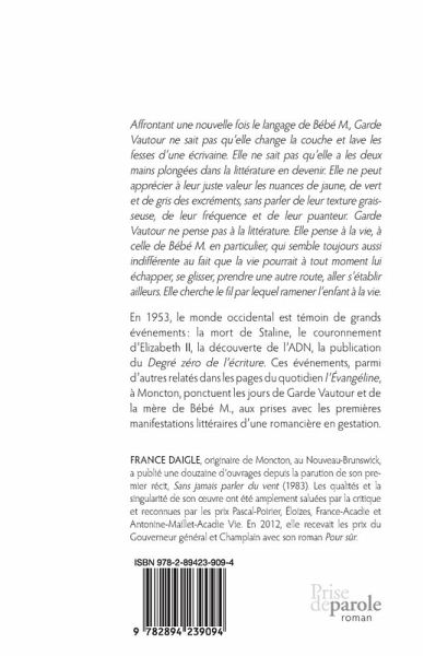 Affrontant une nouvelle fois le langage de Bébé M., Garde Vautour ne sait pas qu’elle change la couche et lave les fesses d’une écrivaine. Elle ne sait pas qu’elle a les deux mains plongées dans la littérature en devenir. Elle ne peut apprécier à leur juste valeur les nuances de jaune, de vert et de gris des excréments, sans parler de leur texture graisseuse, de leur fréquence et de leur puanteur. Garde Vautour ne pense pas à la littérature. Elle pense à la vie, à celle de Bébé M. en particulier, qui semble toujours aussi indifférente au fait que la vie pourrait à tout moment lui échapper, se glisser, prendre une autre route, aller s’établir ailleurs. Elle cherche le fil par lequel ramener l’enfant à la vie. En 1953, le monde occidental est témoin de grands événements : la mort de Staline, le couronnement d’Elizabeth II, la découverte de l’ADN, la publication du Degré zéro de l’écriture. Ces événements, parmi d’autres relatés dans les pages du quotidien l’Évangéline, à Moncton, ponctuent les jours de Garde Vautour et de la mère de Bébé M., aux prises avec les premières manifestations littéraires d’une romancière en gestation.