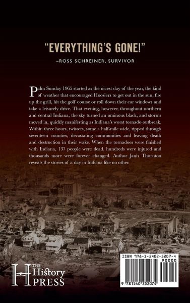 Author Janis Thornton reveals the stories of a day in Indiana like no other. Palm Sunday 1965 started as the nicest day of the year, the kind of weather that encouraged Hoosiers to get out in the sun, fire up the grill, hit the golf course, or roll down their car windows and take a leisurely drive. That evening, however, throughout northern and central Indiana, the sky turned an ominous black, and storms moved in, quickly manifesting as Indiana's worst tornado outbreak. Within three hours, twisters, some a half-mile wide, ripped through seventeen counties, devastating communities and leaving death and destruction in their wake. When the tornadoes were finished with Indiana, 137 people were dead, hundreds were injured, and thousands more were forever changed.