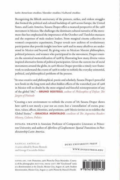 Recognizing the fiftieth anniversary of the protests, strikes, and violent struggles that formed the political and cultural backdrop of 1968 across Europe, the United States, and Latin America, Susana Draper offers a nuanced perspective of the 1968 movement in Mexico. She challenges the dominant cultural narrative of the movement that has emphasized the importance of the October 2nd Tlatelolco Massacre and the responses of male student leaders. From marginal cinema collectives to women's cooperative experiments, Draper reveals new archives of revolutionary participation that provide insight into how 1968 and its many afterlives are understood in Mexico and beyond. By giving voice to Mexican Marxist philosophers, political prisoners, and women who participated in the movement, Draper counters the canonical memorialization of 1968 by illustrating how many diverse voices inspired alternative forms of political participation. Given the current rise of social movements around the globe, in 1968 Mexico Draper provides a new framework to understand the events of 1968 in order to rethink the everyday existential, political, and philosophical problems of the present.