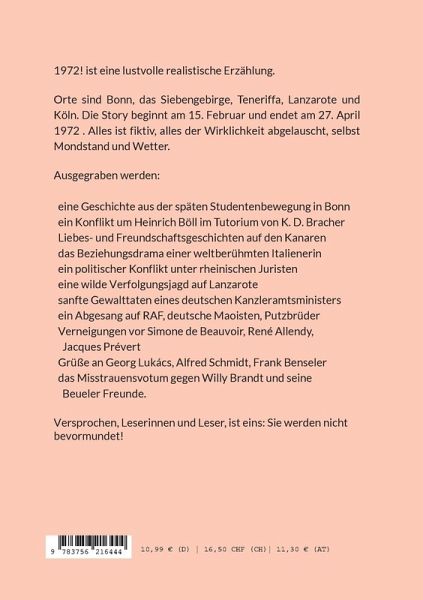 1972! ist eine lustvolle realistische Erzählung.Orte sind Bonn, das Siebengebirge, Teneriffa, Lanzarote undKöln.Die Story beginnt am 15. Februar und endet am 27. April 1972.Alles ist fiktiv, alles der Wirklichkeit abgelauscht, selbstMondstand und Wetter.Ausgegraben werdeneine Geschichte aus der späten Studentenbewegung in Bonnein Konflikt um Heinrich Böll im Tutorium von K. D. BracherLiebes- und Freundschaftsgeschichten auf den Kanarendas Beziehungsdrama einer weltberühmten Italienerinein politischer Konflikt unter rheinischen Juristeneine wilde Verfolgungsjagd auf Lanzarotesanfte Gewalttaten eines deutschen Kanzleramtsministersein Abgesang auf RAF, deutsche Maoisten, PutzbrüderVerneigungen vor Simone de Beauvoir, René Allendy,Jacques PrévertGrüße an Georg Lukács, Alfred Schmidt, Frank Benselerdas Misstrauensvotum gegen Willy Brandt und seineBeueler Freunde.Versprochen, Leserinnen und Leser, ist eins: Sie werden nichtbevormundet!