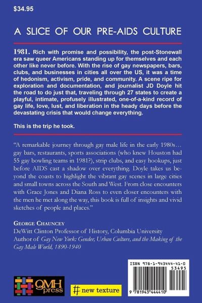 1981. Rich with promise and possibility, the post-Stonewall era saw queer Americans standing up for themselves and each other like never before. With the rise of gay newspapers, bars, clubs, and businesses in cities all over the US, it was a time of hedonism, activism, pride, and community. A scene ripe for exploration and documentation, and journalist JD Doyle hit the road to do just that, traveling through 27 states to create a playful, intimate, profusely illustrated, one-of-a-kind record of gay life, love, lust, and liberation in the heady days before the devastating crisis that would change everything. This is the trip he took. "A remarkable journey through gay male life in the early 1980s...gay bars, restaurants, sports associations (who knew Houston had 55 gay bowling teams in 1981?), strip clubs, and easy hookups, just before AIDS cast a shadow over everything. Doyle takes us beyond the coasts to highlight the vibrant gay scenes in large cities and small towns across the South and West. From close encounters with Grace Jones and Diana Ross to even closer encounters with the men he met along the way, this book is full of insights and vivid sketches of people and places." George Chauncey DeWitt Clinton Professor of History, Columbia University Author of GAY NEW YORK: GENDER, URBAN CULTURE, AND THE MAKING OF THE GAY MALE WORLD, 1890-1940