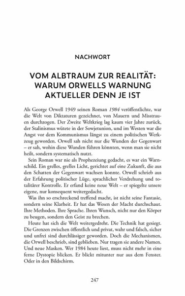 Wenn Denken Verrat ist und Liebe Rebellion - der Roman, der in die Zukunft sah Ein Staat ohne Wahrheit. Ein Leben ohne Freiheit. Ein Mensch gegen die Allmacht. In einer Welt, in der Gedanken kontrolliert, Sprache verdreht und Geschichte täglich umgeschrieben wird, kämpft Winston Smith um das Wertvollste, was ihm bleibt: seinen Verstand - und die Liebe. George Orwells düstere Vision eines totalitären Regimes ist mehr als ein Roman. Sie ist Warnung, Spiegel und Mahnung zugleich. Mit eindringlicher Sprache und prophetischer Klarheit zeichnet 1984 das Bild einer Zukunft, die erschreckend nah erscheint. Ein Meisterwerk über Überwachung, Manipulation und den unbeugsamen Wunsch nach Wahrheit. Wer dieses Buch liest, sieht die Welt nie wieder mit denselben Augen.