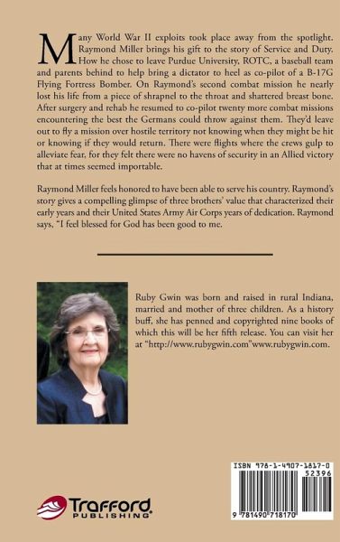 Many World War II exploits took place away from the spotlight. Raymond Miller brings his gift to the story of Service and Duty. How he chose to leave Purdue University, ROTC, a basketball team and parents behind to help bring a dictator to heel as co-pilot of a B-17G Flying Fortress Bomber. On Raymond's second combat mission he nearly lost his life from a piece of shrapnel to the throat and shattered breast bone. After surgery and rehab he resumed to co-pilot twenty more combat missions encountering the best the Germans could throw against them. They'd leave out to fly a mission over hostile territory not knowing when they might be hit or knowing if they would return. There were flights where the crews gulp to alleviate fear, for they felt there were no havens of security in an Allied victory that at times seemed importable. Raymond Miller feels honored to have been able to serve his country. Raymond's story gives a compelling glimpse of three brothers' value that characterized their early years and their United States Army Air Corps years of dedication. Raymond says, "I feel blessed for God has been good to me.