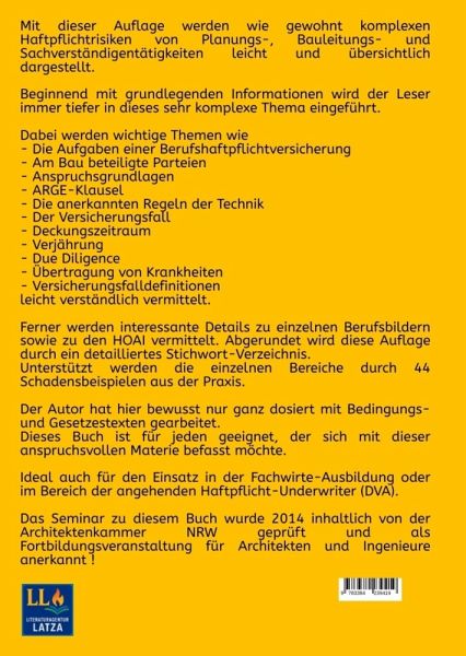 Mit dieser Auflage werden wie gewohnt komplexen Haftpflichtrisiken von Planungs-, Bauleitungs- und Sachverständigentätigkeiten leicht und übersichtlich dargestellt.Beginnend mit grundlegenden Informationen wird der Leser immer tiefer in dieses sehr komplexe Thema eingeführt.Dabei werden wichtige Themen wie- Die Aufgaben einer Berufshaftpflichtversicherung- Am Bau beteiligte Parteien- Anspruchsgrundlagen- ARGE-Klausel- Die anerkannten Regeln der Technik- Der Versicherungsfall- Deckungszeitraum- Verjährung- Due Diligence- Übertragung von Krankheiten- Versicherungsfalldefinitionenleicht verständlich vermittelt.Ferner werden interessante Details zu einzelnen Berufsbildern sowie zu den HOAI vermittelt. Abgerundet wird diese Auflage durch ein detailliertes Stichwort-Verzeichnis.Unterstützt werden die einzelnen Bereiche durch 44 Schadensbeispielen aus der Praxis.Der Autor hat hier bewusst nur ganz dosiert mit Bedingungs- und Gesetzestexten gearbeitet.Dieses Buch ist für jeden geeignet, der sich mit dieser anspruchsvollen Materie befasst möchte.Ideal auch für den Einsatz in der Fachwirte-Ausbildung oder im Bereich der angehenden Haftpflicht-Underwriter (DVA).Das Seminar zu diesem Buch wurde 2014 inhaltlich von der Architektenkammer NRW geprüft und als Fortbildungsveranstaltung für Architekten und Ingenieure anerkannt !