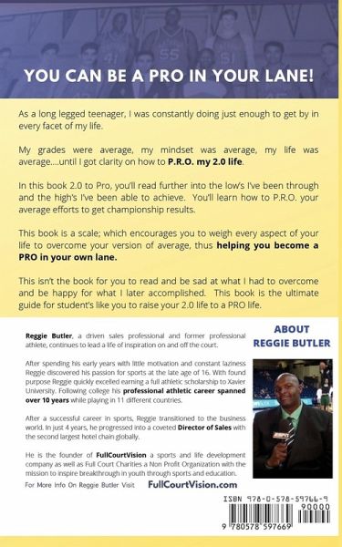 As a long legged teenager, I was constantly doing just enough to get by in every facet of my life. My grades were average, my mindset was average, my life was average….until I got clarity on how to P.R.O. my 2.0 life. In this book 2.0 to Pro, you'll read further into the low's I've been through and the high's I've been able to achieve. You'll learn how to P.R.O. your average efforts to get championship results. This book is a scale; which encourages you to weigh every aspect of your life to overcome your version of average, thus helping you become a PRO in your own lane. This isn't the book for you to read and be sad at what I had to overcome and be happy for what I later accomplished. This book is the ultimate guide for student's like you to raise your 2.0 life to a PRO life.
