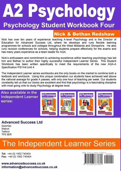 This book looks at issues related to depression and examines one area of psychology in action as well as looking at research methods. It has been specifically developed to give you all the information you need to be able to successfully sit the A2 exam. Book four includes textbook style content, self study activities and exam style questions. All the material is designed to help and guide you through the learning process and to develop strong evaluation and analysis skills.