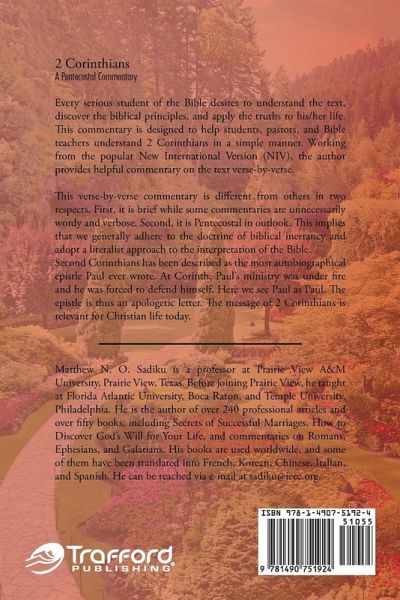 Every serious student of the Bible desires to understand the text, discover the biblical principles, and apply the truths to his/her life. This commentary is designed to help students, pastors, and Bible teachers understand 2 Corinthians in a simple manner. Working from the popular New International Version (NIV), the author provides helpful commentary on the text verse-by-verse. This verse-by-verse commentary is different from others in two respects. First, it is brief while some commentaries are unnecessarily wordy and verbose. Second, it is Pentecostal in outlook. This implies that we generally adhere to the doctrine of biblical inerrancy and adopt a literalist approach to the interpretation of the Bible. Second Corinthians has been described as the most autobiographical epistle Paul ever wrote. At Corinth, Paul's ministry was under fire and he was forced to defend himself. Here we see Paul as Paul. The epistle is thus an apologetic letter. The message of 2 Corinthians is relevant for Christian life today.